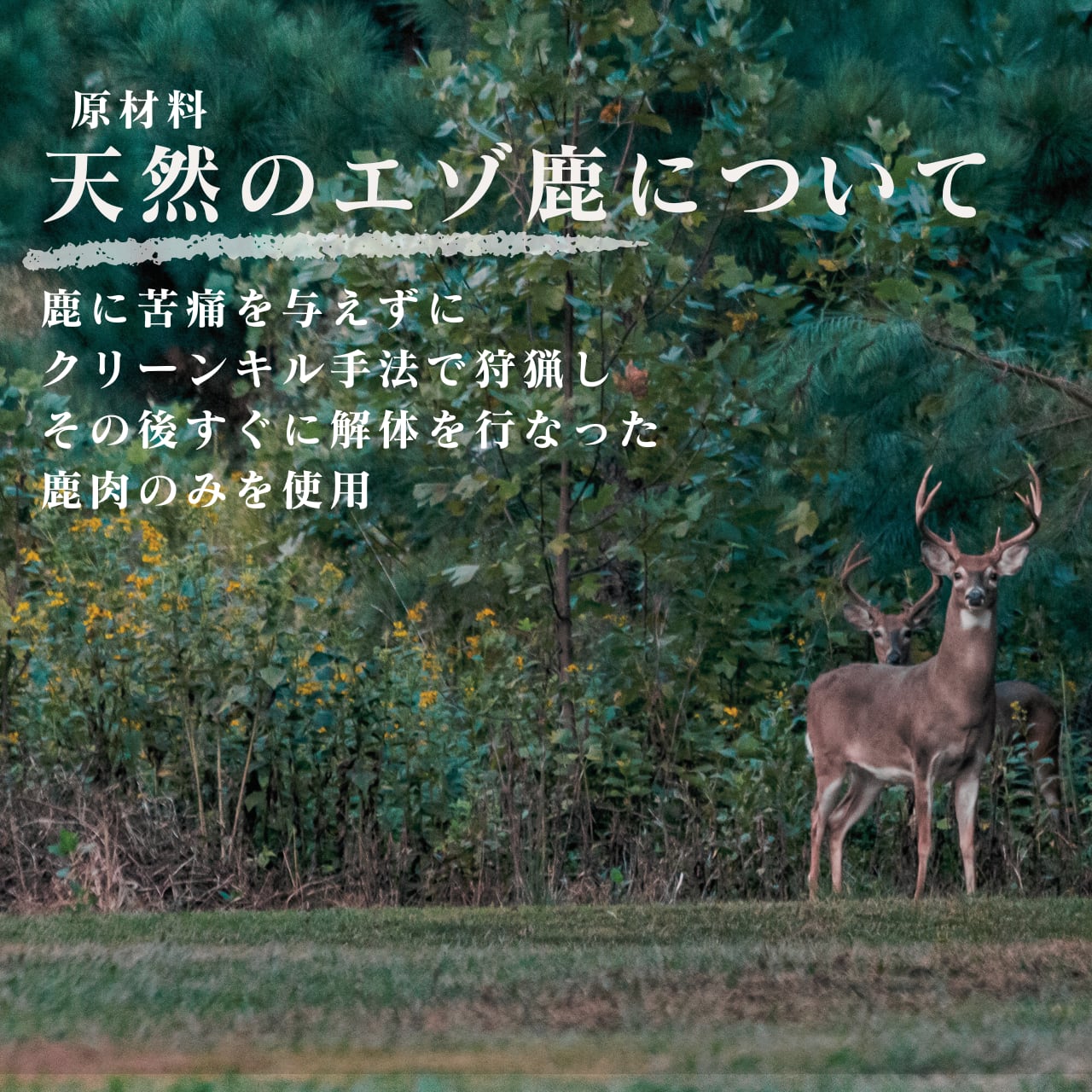 鹿に苦痛を与えずにクリーンキル手法で狩猟し、その後すぐに解体を行なった新鮮な鹿肉のみを使用。